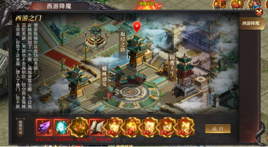 西游大陆玩法内容模块:西游大陆主城、西游之路、囚魔天牢、蟠桃盛宴、全新西游装备