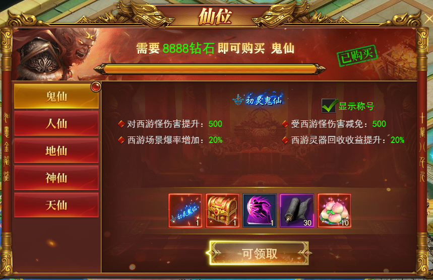 3.一共6个仙位,鬼仙、人仙、地仙、神仙、天仙获取对应的伤害提升,伤害减免,爆率增加,回收收益增加,极高的提升打怪效率