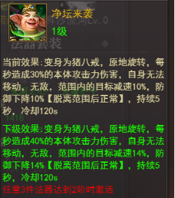 大圣套装单件即可激活,大圣驾到技能,两件技能效果叠加,装备等级越高,大圣降临造成伤害越高
