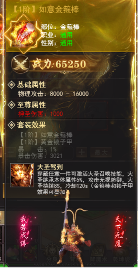 4、特殊装备:大圣套装(如意金箍棒+黄金锁子甲)可激活技能大圣驾到,攻击无视防御