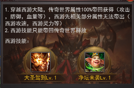 2.西游大陆时空具有大圣和八戒,故西游召唤技能只能带回传世世界释放